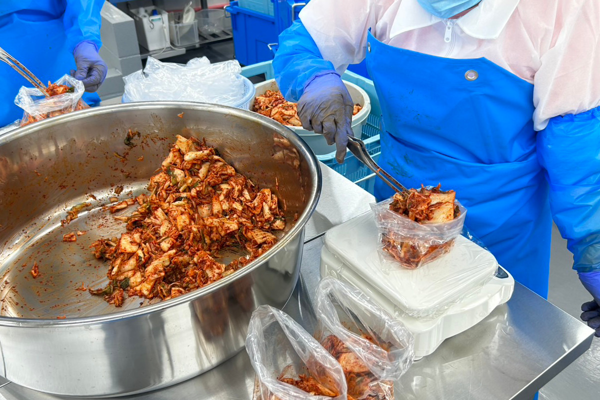 キムチの袋詰め作業